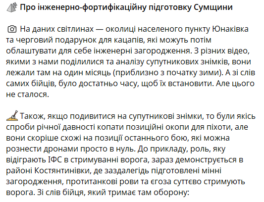 Автори допису навели приклад інженерно-фортифікаційної підготовки в районі Костянтинівки Донецької області, де підготовлені заздалегідь мінні загородження, протитанкові рови та колюча стрічка "Єгоза" суттєво допомагають стримувати наступ РФ.