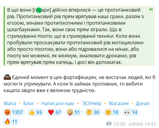 "Протитанковий рів прям врятував наші ср*ки, разом з "Єгозою", мінами протипіхотними і протитанковими шлагбаумами. Так, вони своє прям зіграли. Що в стримуванні піхоти, що в стримуванні техніки", — сказав військовий.