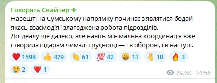 Військовий 24 ОМБр ЗСУ Станіслав Бунятов у своєму телеграм-каналі "Говорять Снайпер" 24 червня повідомив, що на Сумщині покращилася взаємодія українських підрозділів.