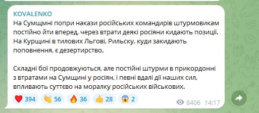 "На Сумщині попри накази російських командирів штурмовикам постійно йти вперед, через втрати деякі росіяни кидають позиції. На Курщині в тилових Льгові, Рильску, куди закидають поповнення, є дезертирство", — проінформував Коваленко.