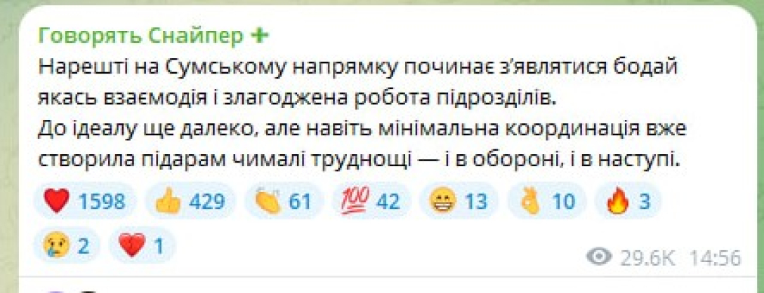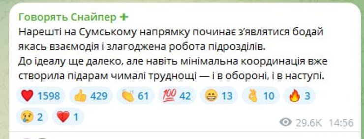 "Нарешті на Сумському напрямку починає зʼявлятися бодай якась взаємодія і злагоджена робота підрозділів. До ідеалу ще далеко, але навіть мінімальна координація вже створила п**арам чималі труднощі — і в обороні, і в наступі", — написав він.