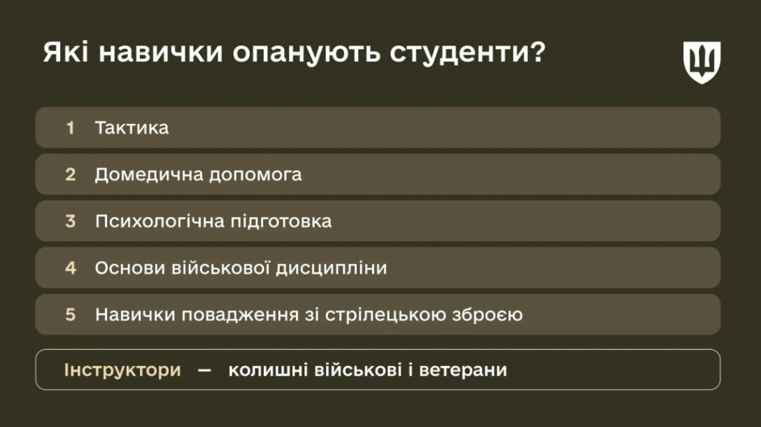 Під час вишколу студенти опанують знання з тактики, домедичної допомоги, основ військової дисципліни, психології, а також навички поводження зі стрілецькою зброєю та орієнтування на місцевості. Інструкторами будуть досвідчені військовослужбовці у відставці та ветерани.