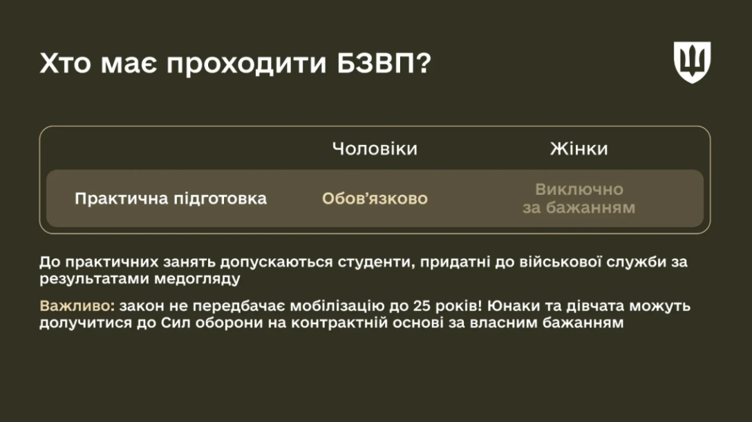 Теорію викладатимуть усім здобувачам освіти без виключення. Практичну ж частину БЗВП повинні будуть пройти всі придатні за станом здоров'я чоловіки. Для студенток вона добровільна, та для цього необхідно стати на військовий облік у територіальному центрі комплектування та соціальної підтримки.