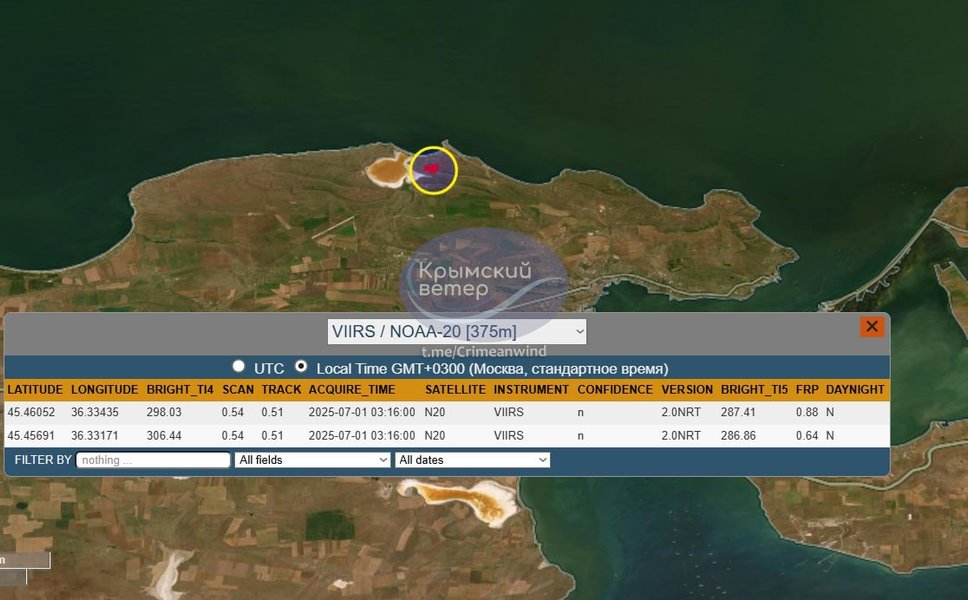 На південь від села Курортне Ленінського району, яке розташоване на березі Азовського моря, супутники NASA вночі зафіксували потужну пожежу.