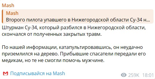 Штурман винищувача Су-34 Збройних сил Російської Федерації не вижив після катапультування, яке відбулось через негаразди під час приземлення. Інший член екіпажу врятувався і його передали медикам.