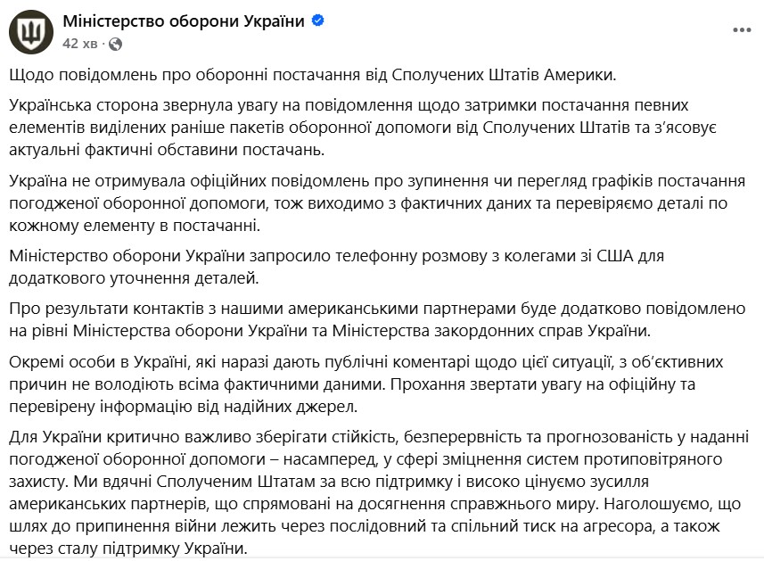 "Україна не отримувала офіційних повідомлень про зупинення чи перегляд графіків постачання погодженої оборонної допомоги. Міноборони запросило телефонну розмову з колегами зі США для додаткового уточнення деталей", — ідеться у дописі.