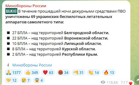 Міноборони Росії заявило про знищення 120 дронів за ніч. Втім у списку атакованих регіонів Краснодарський край не згадується.