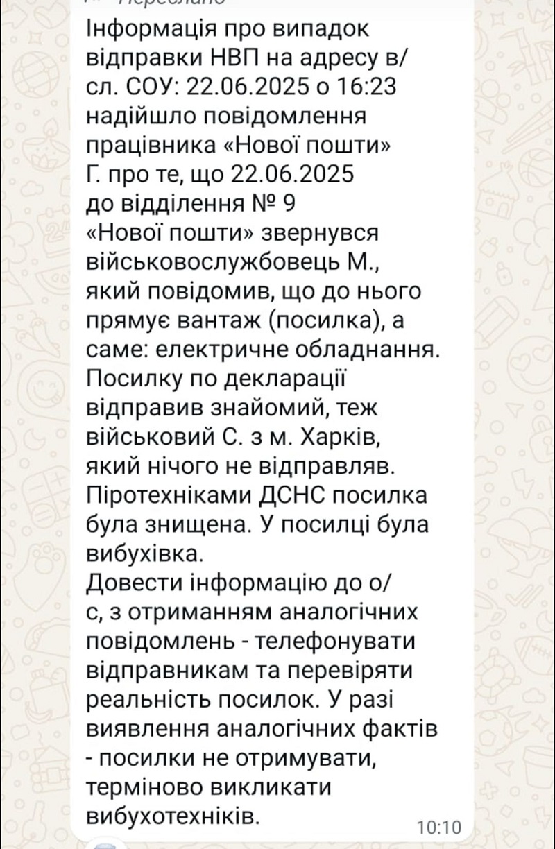 Вона опублікувала скрін, у якому повідомляється, що до співробітника "Нової пошти" звернувся військовослужбовець і розповів, що до нього з Харкова йде посилка від товариша по службі, у якій, судячи з опису в накладній, електричне обладнання.
