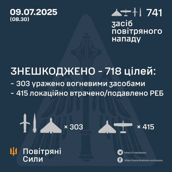 Повідомляється, що у ніч на 9 липня ЗС РФ атакували 741 засобом повітряного нападу: