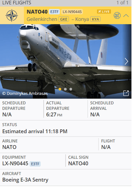 Це був американський літак дальнього радіолокаційного виявлення Boeing E-3A Sentry. Маршрут рейсу пролягав від німецького міста Гайленкірхен до турецької Коньї.