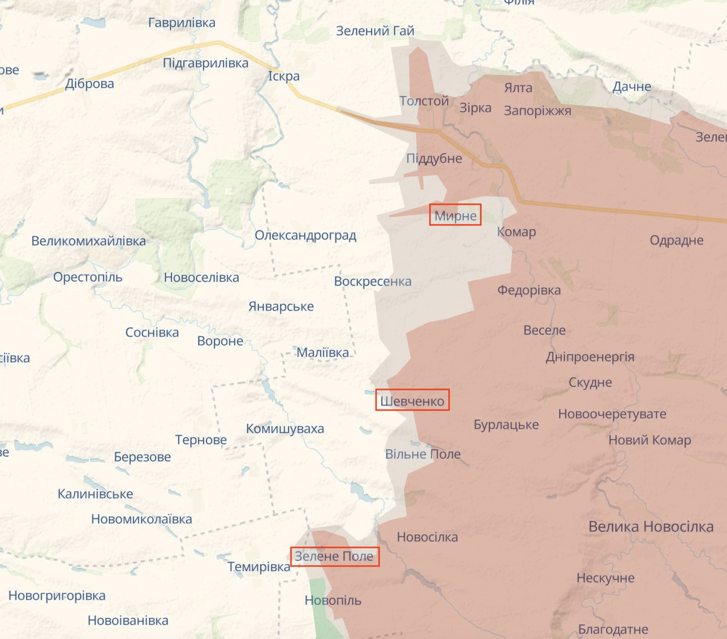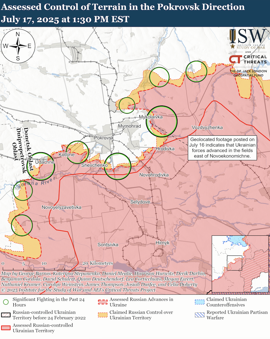 17 липня аналітики DeepState також інформували про просування ЗС РФ на Покровському напрямку, а саме окупацію населеного пункту Шевченко й просування поблизу Зеленого Поля, Мирного та Піщаного.