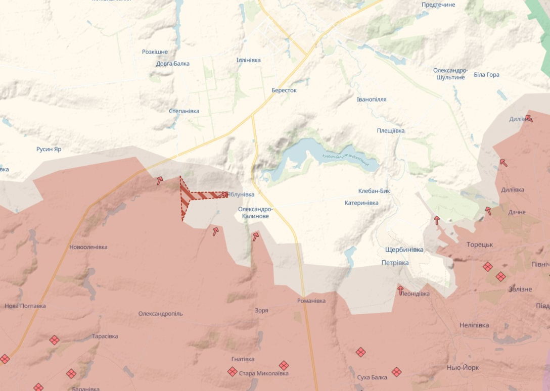 Незначне просування військ ворога помічено і на Краматорському напрямку, однак тут динаміка подій відрізняється від ситуації, яка склалася на ділянці вздовж траси Н15. Імовірно, ворожі війська прагнуть вирівняти фронт по лінії Яблунівка — Катеринівка — Торецьк, за якою розташоване Клебан-Бицьке водосховище.