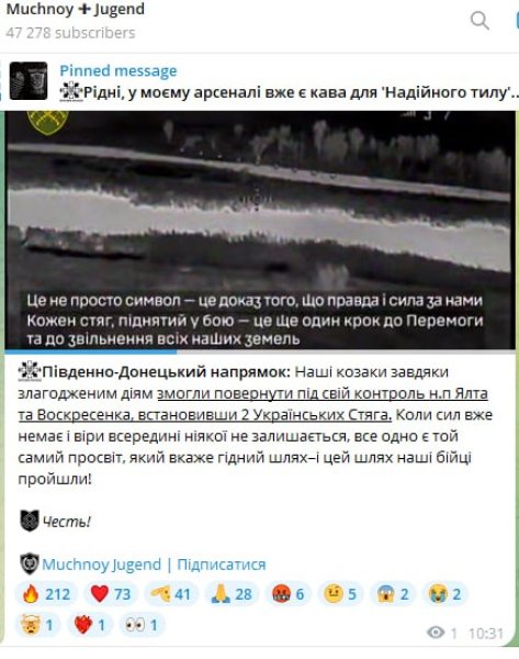 "Наші козаки завдяки злагодженим діям змогли повернути під свій контроль населені пункти Ялта і Воскресенка, встановивши 2 українські стяги. Коли сил вже немає і віри всередині ніякої не залишається, все одно є той самий просвіт, який вкаже гідний шлях — і цей шлях наші бійці пройшли", — написав він.
