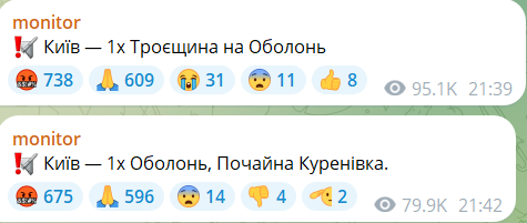 Моніторингові канали помітили рух дронів до районів Троєщина та Оболонь.