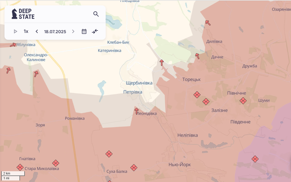 Ворог мав успіхи в районі населених пунктів Юнаківка, Хатнє, Романівка та Торецьк. Про актуальну ситуацію на фронті розповіли аналітики проєкту DeepState у своєму зведенні уночі 19 липня.