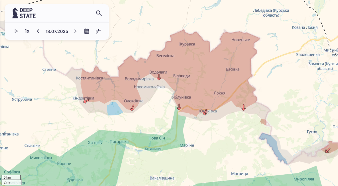 У Сумській області ЗС РФ захопили Яблунівку — село в Юнаківській сільській громаді Сумського району. Також росіяни просунулися поблизу населеного пункту Юнаківка, що розташований на південний схід від Яблунівки. Відповідні зміни в ситуації на Сумщині можна побачити на онлайн-мапі проєкту.