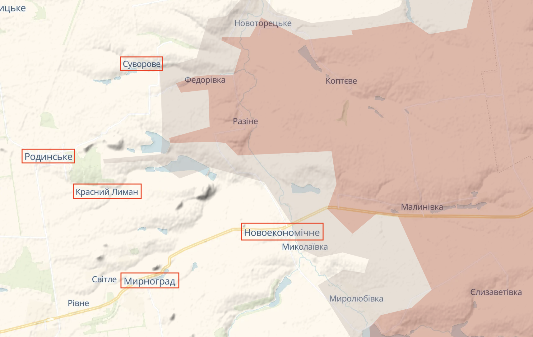 В районі Мирнограда, з його слів, ЗС РФ зайшли на східні й південно-східні околиці селища Новоекономічне. Вони намагаються прорватись до центру, але повного контролю не мають.