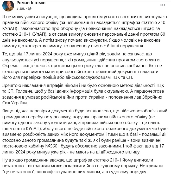 "Те, що з 17 липня 2024 року вже минув цілий рік, зовсім не означає, що анулюються всі порушення, вчинені громадянином упродовж свого життя. Окремо — якщо чоловік протягом цього року так і не оновив свої дані. Як і не скасовується вимога мати при собі військово-обліковий документ і надавати його для перевірки поліції або військовослужбовцям ТЦК і СП", — повідомив військовий в Facebook.