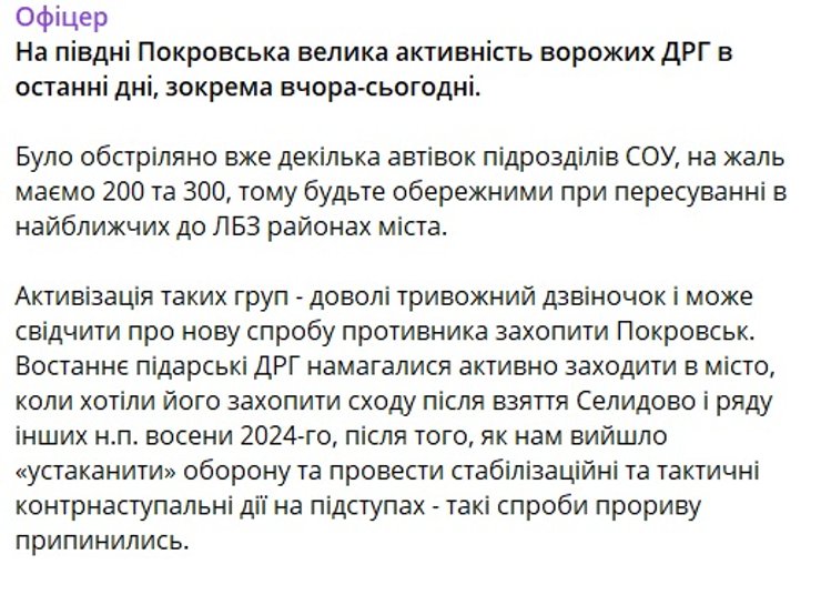 "На півдні Покровська велика активність ворожих ДРГ в останні дні, зокрема, вчора-сьогодні. Було обстріляно вже кілька автомобілів підрозділів СОУ, на жаль, маємо 200 і 300, тому будьте обережні під час пересування в найближчих до ЛБО районах міста", — пише він.