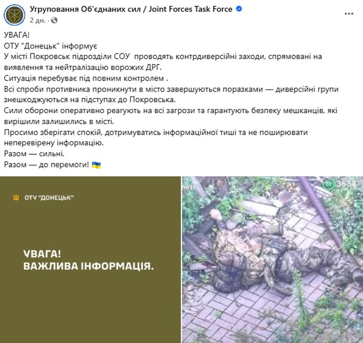 Двома днями раніше ОТУ "Донецьк" повідомляло, що в Покровську підрозділи СОУ проводять контрдиверсійні заходи, спрямовані на виявлення та нейтралізацію ворожих ДРГ. "Ситуація перебуває під повним контролем. Усі спроби противника проникнути в місто завершуються поразками — диверсійні групи знешкоджуються на підступах до Покровська. Сили оборони оперативно реагують на всі загрози та забезпечують безпеку мешканців, що наважилися в місті. Просимо зберігати спокій, дотримуватися інформаційної тиші та не поширювати неперевірену інформацію", — йдеться в повідомленні на Facebook.
