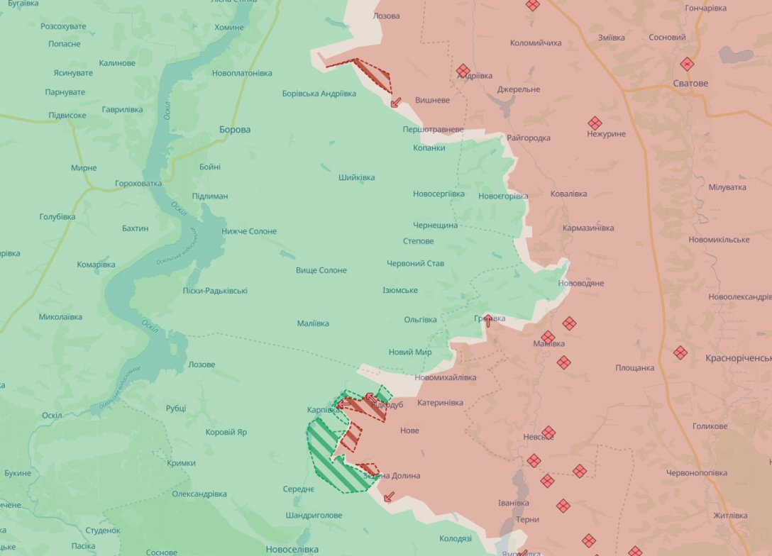 Також у DeepState уточнили дані щодо ситуації на Лиманському напрямку, де лінія фронту незначно змінилася — частина території позначена підконтрольною Силам оборони, а в районі Рідкодуба і на захід від Липового, ділянка була зайнята росіянами.