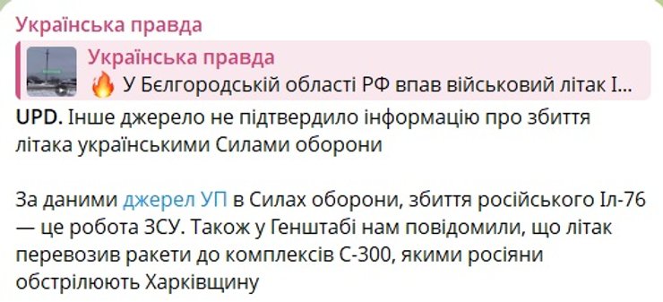 Видання "Українська правда", посилаючись на свої джерела, одним із перших повідомило про авіакатастрофу Іл-76 у Бєлгородській області. У Генштабі стверджували, що літак перевозив ракети до комплексів С-300, якими росіяни обстрілюють Харківську область, проте пізніше цю інформацію спростували.