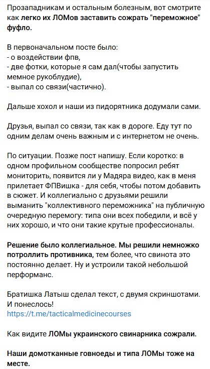 У дописі Філатов насміхається з усіх, хто повірив у його смерть. Крім того, публікує серію скриншотів з Z-пабліків, які поширили фейкове повідомлення про його загибель. Також вказується, що він з колегою підібрав фото, яке показує начебто момент влучання, і навмисно поширив його у соцмережі. Також Z-військкор опублікував скриншоти листування інших пропагандистів, які раділи його смерті. А нижче — репости з каналів, які перепрошували за поширення фейків.