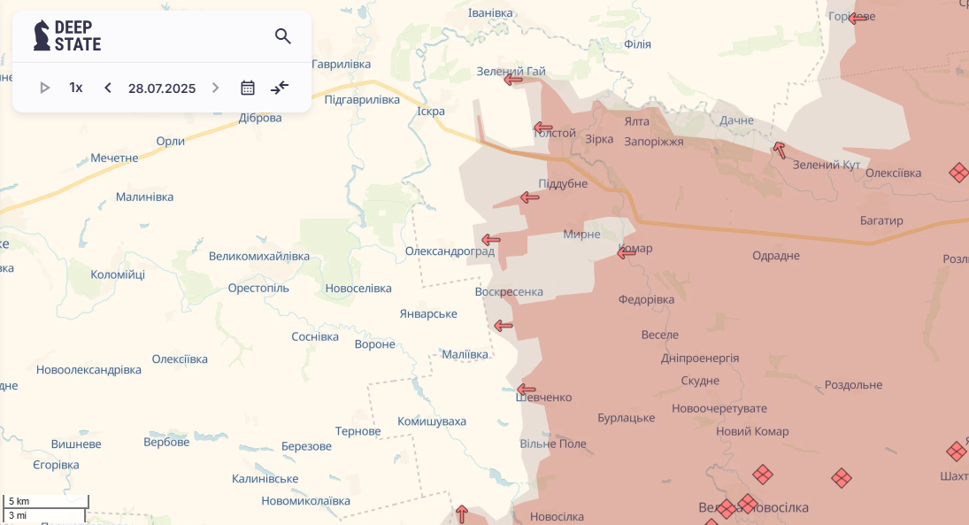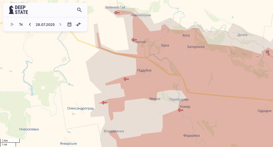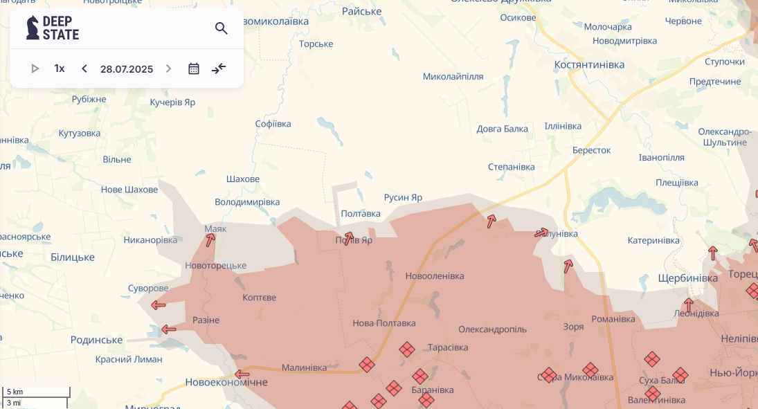 "Ворог просунувся біля Полтавки та у Воскресенці", — повідомили аналітики проєкту DeepState у своєму зведенні про ситуацію на фронті уночі 29 липня.