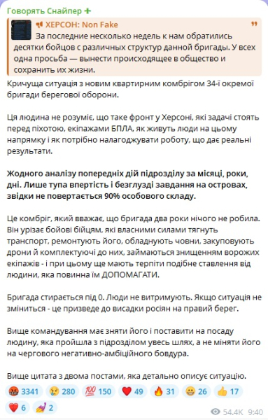"Жодного аналізу попередніх дій підрозділу за місяці, роки, дні. Лише тупа впертість і безглузді завдання на островах, звідки не повертається 90% особового складу… Бригада стирається під 0. Люди не витримують. Якщо ситуація не зміниться — це призведе до висадки росіян на правий берег", — написав Бунятов.
