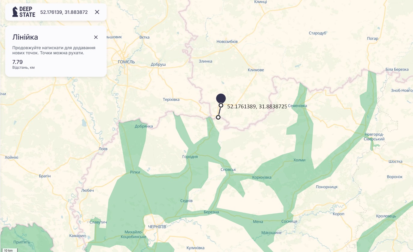 На карті бойових дій DeepState можна позначити точку підриву. Тоді бачимо, що український оптоволоконний дрон пролетів близько 7 км (по прямій), щоб вразити ключовий міст на кордоні.
