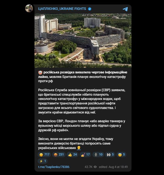 Російська Служба зовнішньої розвідки оприлюднила нову інформаційну атаку, стверджуючи, що британські спецслужби нібито готують "екологічну катастрофу" у міжнародних водах.