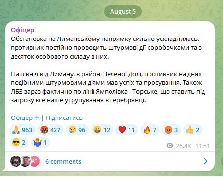 "Обстановка на Лиманському напрямку сильно ускладнилась, противник постійно проводить штурмові дії коробочками та з десяток особового складу в них. На північ від Лиману, в районі Зеленої Долі, противник днями подібними штурмовими діями мав успіх та просування", — написав він.