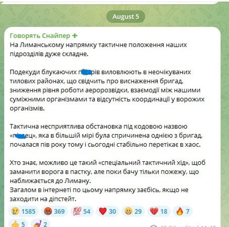 Боєць наголосив, що тактичну несприятливу обстановку можна описати "кодовою назвою "п**дець". На його думку, у проблемах винна одна з бригад, яка тримає позиції під Лиманом.