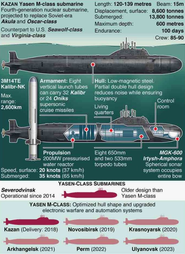 Підводні човни проєкту 885М класу "Ясень-М" є відповіддю Росії на зростання напруженості у світовому океані. Їхня водотоннажність у підводному положенні становить 13 800 тонн. Реактор ОК-650В.02 забезпечує автономність до 30 років. Корпус субмарини виконано з використанням акустичної ізоляції та міцної сталі, що знижує помітність на глибині.