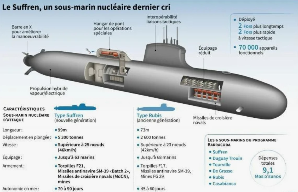 Французька програма Barracuda стала новим етапом розвитку підводних сил країни. Перший човен "Suffren" став до ладу 2022 року, другий — 2023-го. Цей клас субмарин має водотоннажність 5 300 тонн і оснащений реактором K15. Гідроакустичний комплекс S-CUBE компанії Thales і бойова система SYCOBS забезпечують високоточну ідентифікацію загроз і управління озброєнням.