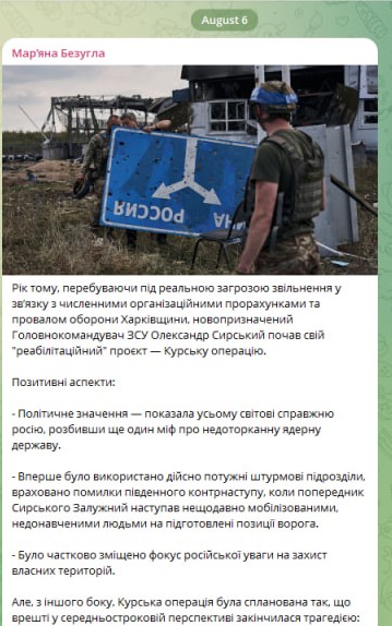 Народна депутатка Мар'яна Безугла вважає, що Курська операція допомогла головкому ЗСУ Олександру Сирському закріпитися на посаді, а українське військо зазнало шалених втрат і ніхто не поніс за це покарання. Про це вона написала у своєму телеграм-каналі.