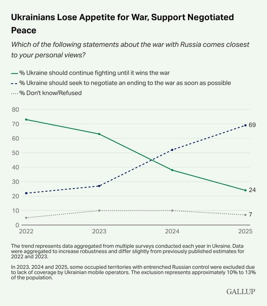 Згідно з новим опитуванням, проведеним аналітичною організацією Gallup, громадська думка в Україні кардинально змінилася. Якщо у 2022 році 73% респондентів підтримували ідею війни до перемоги, то у липні 2025 року такий підхід схвалюють лише 24%. Натомість 69% вважають, що війну слід завершити якомога швидше шляхом переговорів.