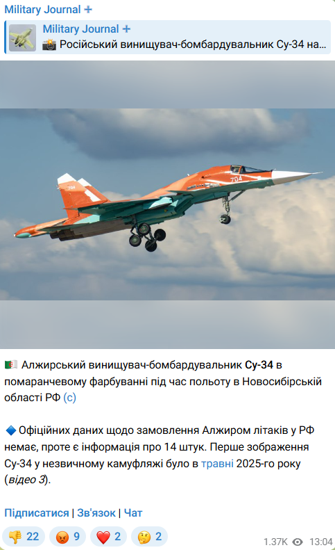Офіційно про угоду між Алжиром і РФ про купівлю літаків Су-34, проте адміни каналу нагадали про зроблене раніше замовлення на експорт 14 винищувачів.