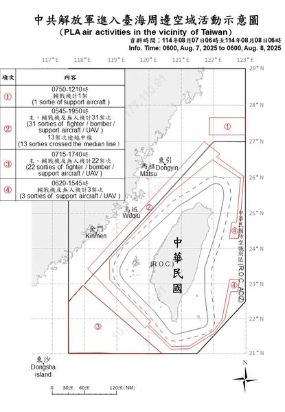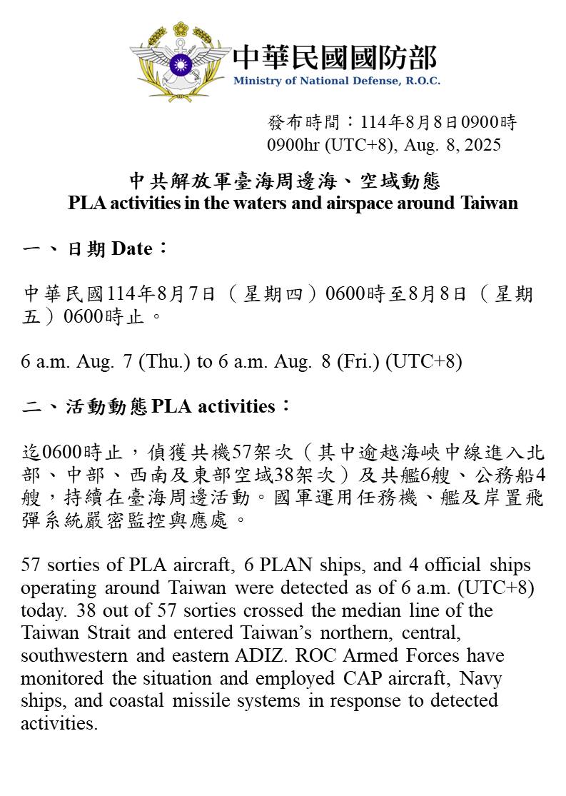 Народно-визвольна армія Китаю (НВАК) збільшує присутність біля острова. Міністерство оборони Тайваню фіксує на 8 серпня 57 літаків і 10 кораблів.