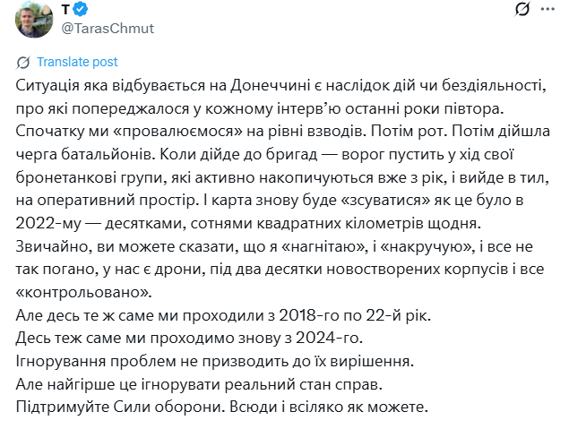 "Звичайно, ви можете сказати, що я "нагнітаю", і "накручую", і все не так погано, у нас є дрони, під два десятки новостворених корпусів і все "контрольовано". Але десь те ж саме ми проходили з 2018-го по 22-й рік. Десь теж саме ми проходимо знову з 2024-го", — зазначив Чмут.