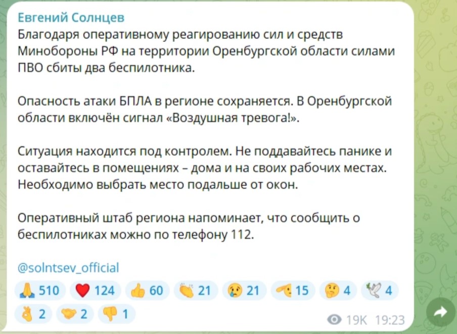 Атаку українських дронів на російський регіон підтвердила місцева влада. Тимчасовий виконувач обов'язків губернатора Оренбурзької області Євген Солнцев повідомив, що завдяки діям сил ППО Міноборони РФ нібито було збито два безпілотники. Водночас Міністерство оборони РФ уточнило, що на території регіону "було знищено три дрони".