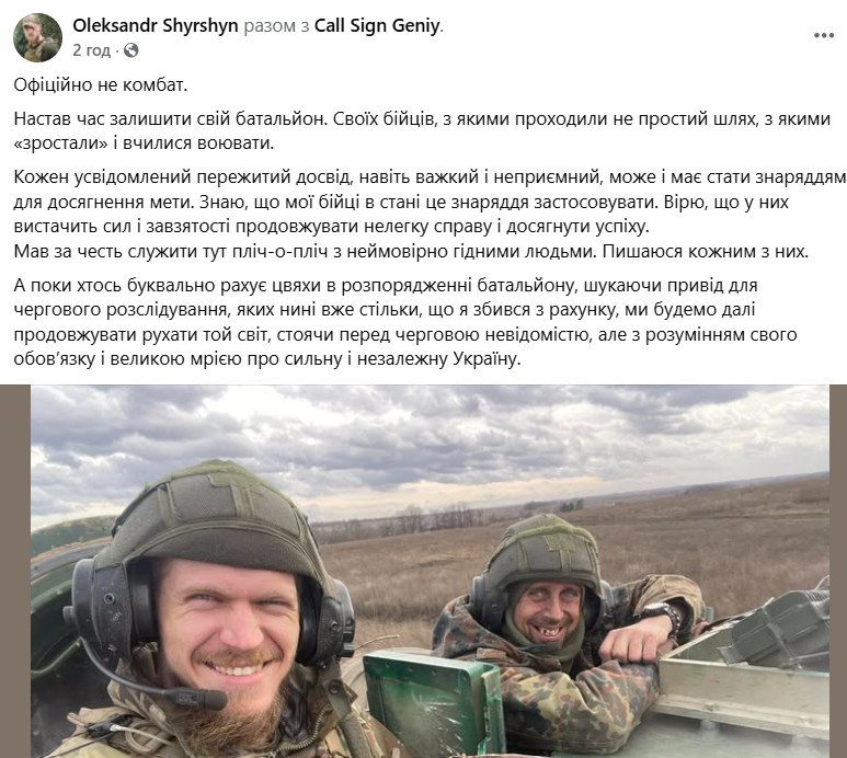"Настав час залишити свій батальйон. Своїх бійців, з якими проходили не простий шлях, з якими "зростали" і вчилися воювати", — повідомив Олександр Ширшин.