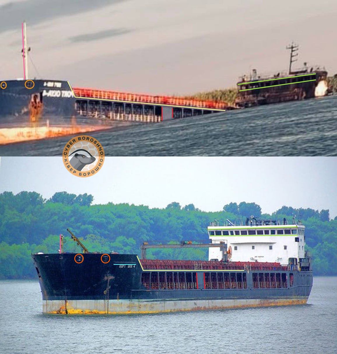 Тим часом у Telegram-каналі OSINTерів Кіберборошно відшукали фото суховантажу "Порт Оля 4" до подій 15 серпня та після. Аналітики помітили дві характерні точки на бортах і запевнили, що, схоже, ідеться саме про нього. Втім, не ясно, зображення реальне чи фотомонтаж.