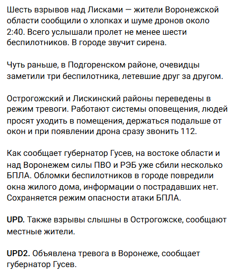 Невдовзі губернатор Воронезької області Гусєв повідомив, що на сході області та над самим обласним центром сили ППО нібито збили кілька ударних дронів.
