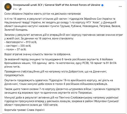 Українські підрозділи встановили контроль у ключових локаціях та завдали значних втрат ворогу. Зокрема, Сили оборони зачистили низку населених пунктів на Донеччині, серед яких місто Покровськ.