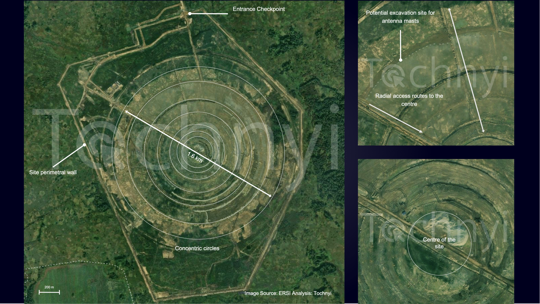 Зараз територія оточена стіною. На зовнішній території є розкопки для антенних щогл. Також можна побачити щонайменше шість кілець. Кругова симетрія вказує на те, що антена з діапазоном частот від кількох МГц до 28 МГц буде розташовуватися по колу, пояснили розслідувачі.