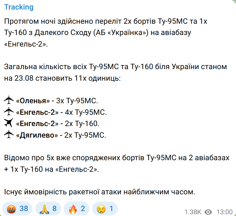 Моніторинговий канал Tracking у Telegram повідомляє, що переліт бортів стратегічної авіації Збройних сил РФ було зафіксовано в ніч на 23 серпня. Зазначається, що з авіабази "Українка" в Амурській області на Далекому Сході РФ до авіабази "Енгельс-2" в Саратовській області перемістилися два стратегічні бомбардувальники Ту-95МС та один Ту-160.