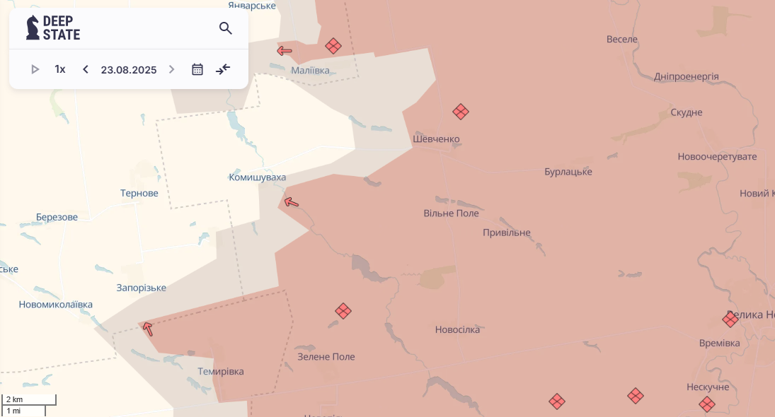 На Донеччині та Запоріжжі російська армія просунулася у районі трьох населених пунктів. Про це повідомили аналітики проєкту DeepState у зведенні про ситуацію на фронті 24 серпня.