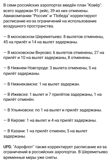 "У семи російських аеропортах введено план "Килим": всього затримано 91 рейс, 39 з них скасовано", — повідомляли росЗМІ.