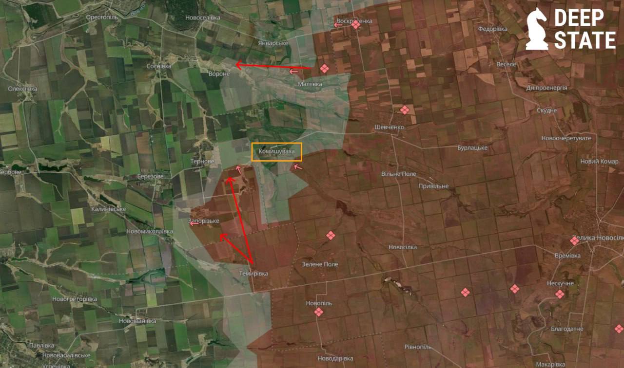 За даними команди DeepState, російські війська захопили села Запорізьке і Новогеоргіївка в Дніпропетровській області. Генштаб ЗСУ спростовує ці дані і заявляє про гарячі бої за населені пункти.